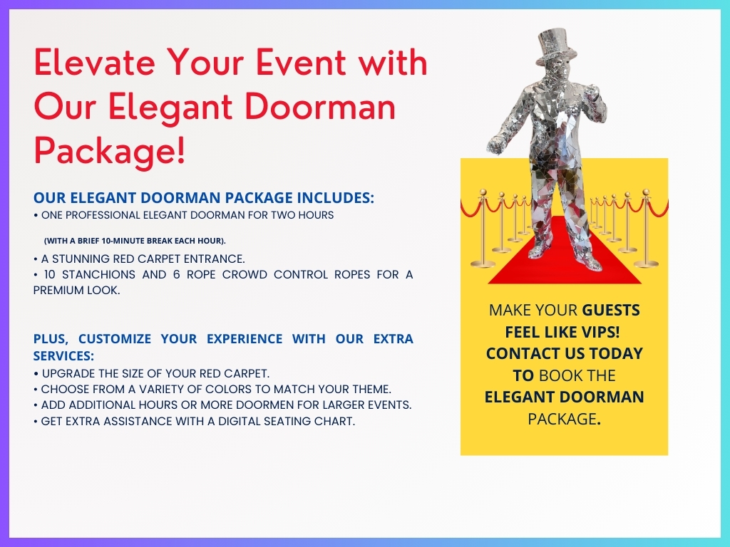 Make your guests feel like VIPs!Contact us today to book the Elegant Doorman Package.